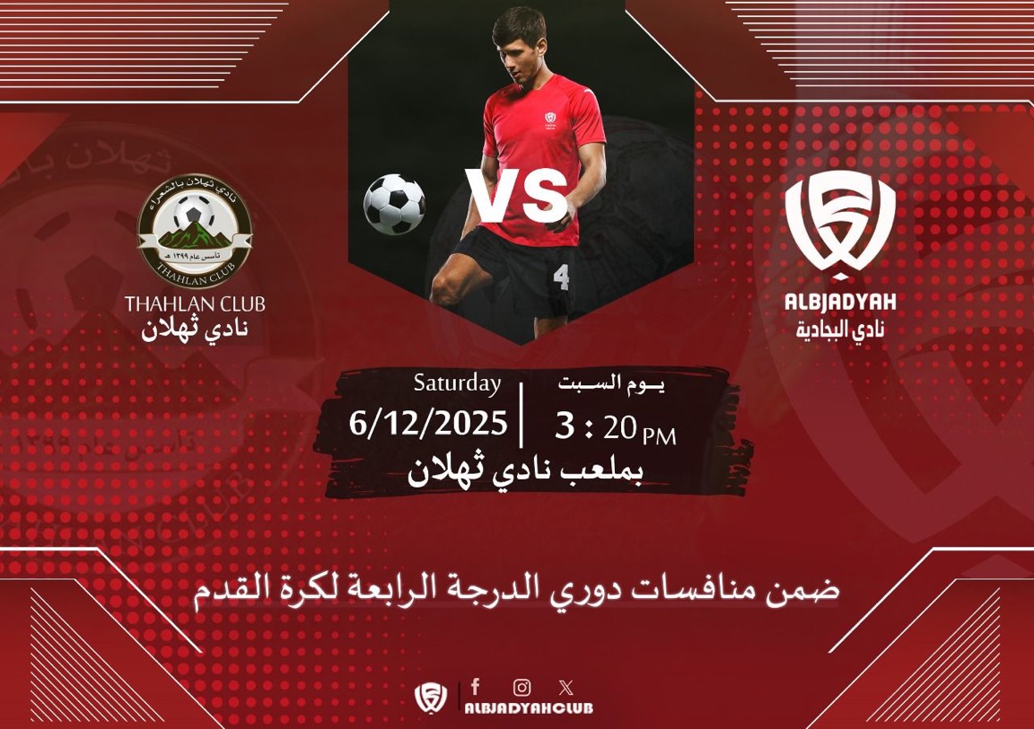 بطاقة اللقاء 🏆 المباراة: البجادية 🆚 ثهلان 📅 السبت 06 / 12 / 2025 🕞 الساعة 3:20 مساءً 📍 ملعب نادي ثهلان